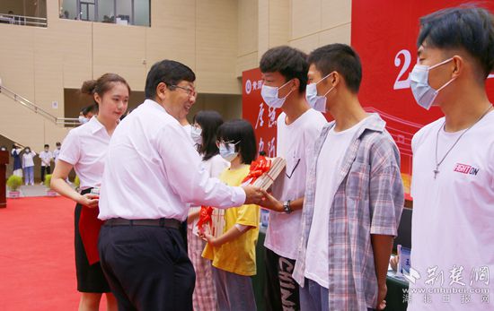 黃岡師范學(xué)院黨委書記王立兵為新生贈(zèng)送生日禮物。通訊員 供圖