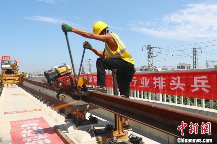 圖為9月10日,安九高鐵鋪軌現(xiàn)場,施工人員對長軌進行切割?!⒄祭?攝