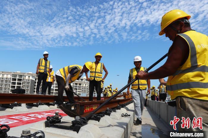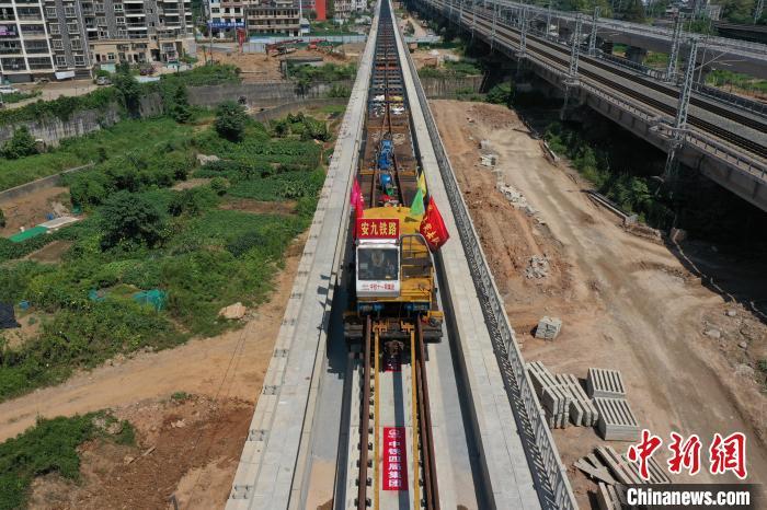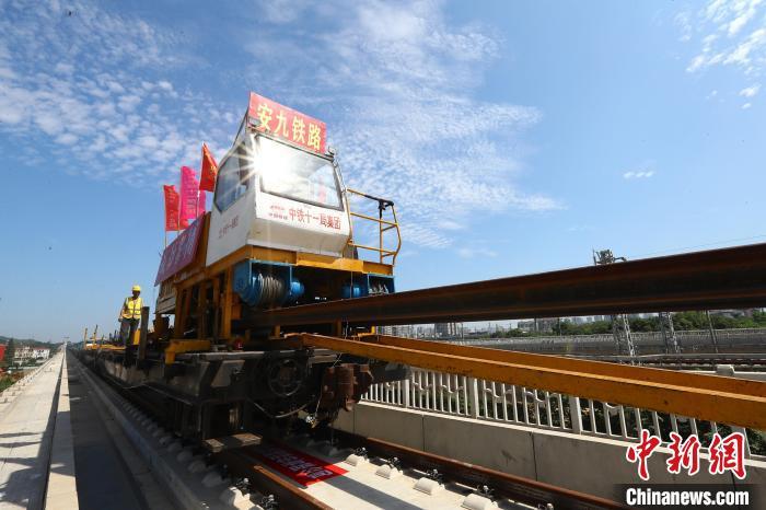 圖為9月10日上午,施工人員在大型鋪軌機的協(xié)助下,把長軌鋪設(shè)在無砟道床上?!⒄祭?攝