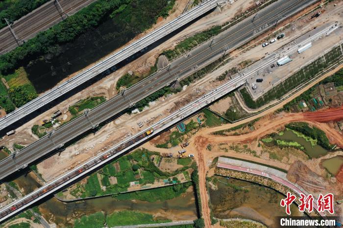 當(dāng)日,中新社記者在安九高鐵鋪軌現(xiàn)場看到,烈日之中,數(shù)十名頭戴安全帽、身穿黃馬甲的工人,在大型鋪軌機的協(xié)助下,把兩根長長的鋼軌緩緩地鋪在無砟軌道床上。