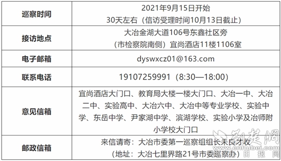 大冶市委第一巡察組在市教育局巡察“回頭看”期間的具體聯(lián)系方式。來(lái)源:大冶發(fā)布