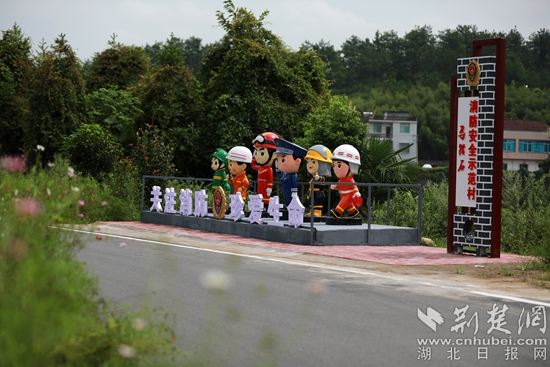 “農村防火基礎一直比較薄弱,提高村民的消防安全意識就要潛移默化,所以我們就想著在這里打造一個示范點”,蘄春縣張榜鎮(zhèn)一位工作人員介紹。石頭做的村牌,背景是一塊向陽的坡地,“人民至上,生命至上”八個紅色大字赫然在目。