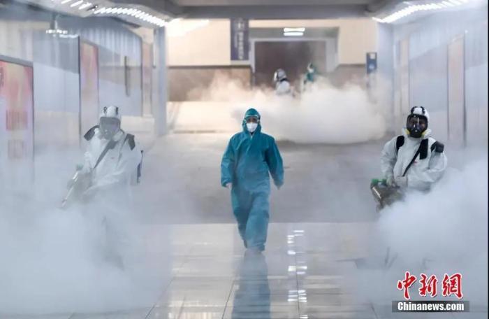 資料圖:十余位來自長沙藍(lán)天救援隊(duì)的志愿者手持重型消毒機(jī)器,對長沙火車站內(nèi)外進(jìn)行消毒殺菌。中新社記者 楊華峰 攝