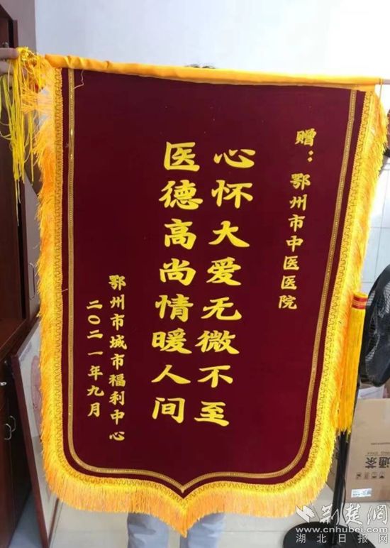 荊楚網(wǎng)(湖北日報網(wǎng))訊(通訊員 嚴炎)9月18日上午,鄂州市城市福利中心為鄂州市中醫(yī)醫(yī)院送來了一面寫著“心懷大愛無微不至,醫(yī)德高尚情暖人間”的錦旗,向鄂州市中醫(yī)醫(yī)院駐守城市福利中心的醫(yī)務人員表示感謝。