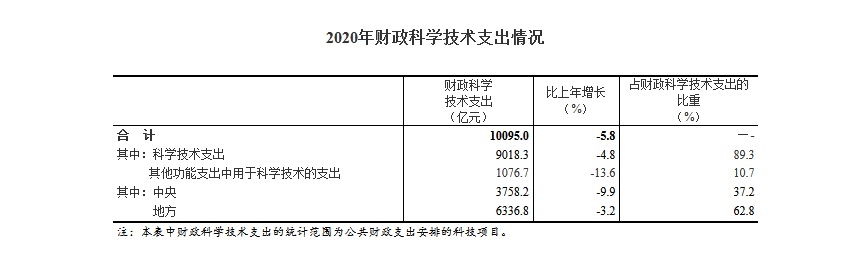 2020年,國家財政科學(xué)技術(shù)支出10095.0億元,比上年減少622.4億元,下降5.8%。其中,中央財政科學(xué)技術(shù)支出3758.2億元,下降9.9%,占財政科學(xué)技術(shù)支出的比重為37.2%;地方財政科學(xué)技術(shù)支出6336.8億元,下降3.2%,占比為62.8%。