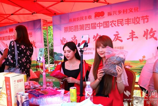 在農(nóng)產(chǎn)品直播推介展區(qū),主播們現(xiàn)場(chǎng)直播“帶貨”,為網(wǎng)友們推介崇陽(yáng)縣特色農(nóng)副產(chǎn)品,吸引了眾多網(wǎng)友咨詢(xún)下單。