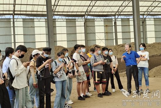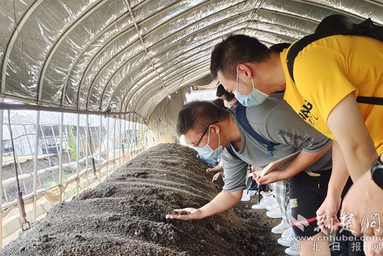 華農(nóng)師生在生態(tài)治理蚯蚓大棚現(xiàn)場交流蚯蚓養(yǎng)殖相關技術。通訊員供圖