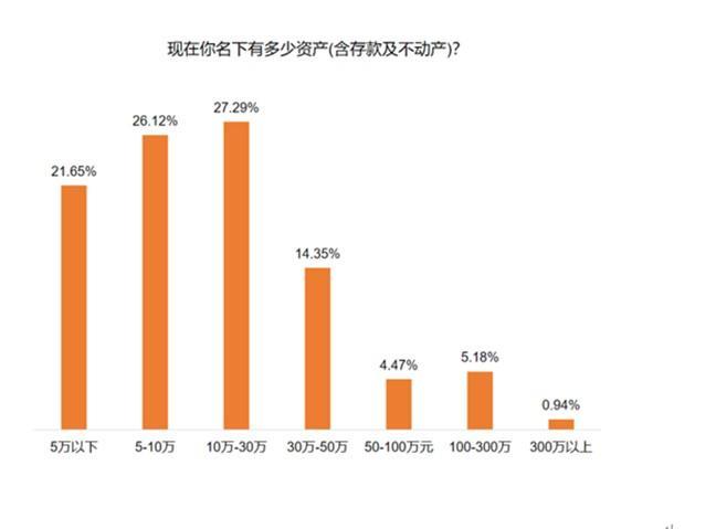 當(dāng)被問(wèn)到名下有多少資產(chǎn)時(shí),超7成“90后”職場(chǎng)人名下資產(chǎn)不超過(guò)30萬(wàn)。其中,“10萬(wàn)-30萬(wàn)”占比最高,為27.29%;其次是“5萬(wàn)-10萬(wàn)”,占比26.12%;再者是“5萬(wàn)以下”占比21.65%;名下資產(chǎn)在“30萬(wàn)-50萬(wàn)”的占比為14.35%;“100-300”萬(wàn)的占比為5.18%。也就是說(shuō),名下資產(chǎn)超過(guò)30萬(wàn)的“90后”職場(chǎng)人占約1/4。