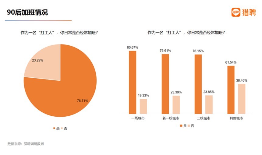 分地域來(lái)看,一線(xiàn)城市經(jīng)常加班的“90后”職場(chǎng)人占比超80%;在新一線(xiàn)城市占比為76.61%;在二線(xiàn)城市占比為76.15%;在三線(xiàn)及以下城市占比為61.54%。由此可見(jiàn),隨著城市變小,經(jīng)常加班的情況有所緩解。