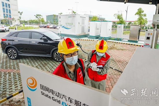 國網(wǎng)黃岡供電公司員工為充電客戶解答充電問題。通訊員供圖