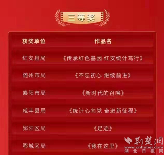 鄂城區(qū)統(tǒng)計局參賽作品從全省各市州、縣(市、區(qū))作品中脫穎而出入圍決賽,經(jīng)專家評審和線上人氣綜合評定,榮獲全省三等獎。