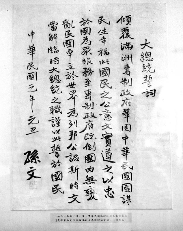 △孫中山先生就任臨時大總統(tǒng)時的誓詞(資料照片)