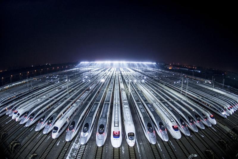 △動車組??吭谖錆h動車段的存車線上,準(zhǔn)備進(jìn)行檢修和保溫作業(yè)(2018年2月1日攝)。