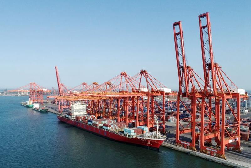 △一艘輪船靠泊在唐山港京唐港區(qū)集裝箱碼頭裝貨(無人機(jī)照片,2021年4月8日攝)。