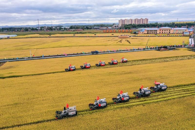 △在吉林省長春市九臺區(qū)龍嘉街道紅光村,農(nóng)民駕駛農(nóng)機(jī)進(jìn)行水稻收割作業(yè)(無人機(jī)照片,2021年9月23日攝)。