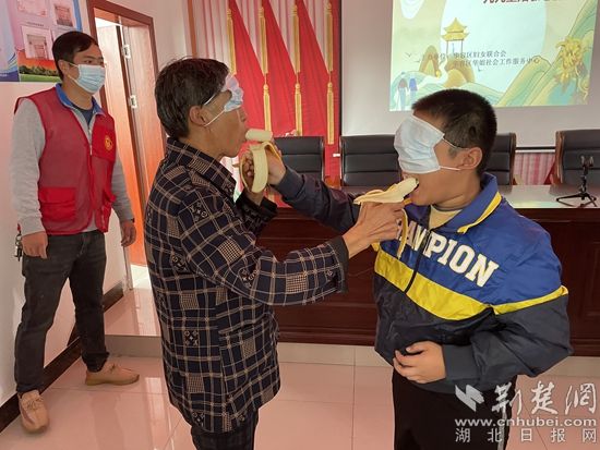 互動(dòng)游戲——爺爺奶奶和小朋友面對(duì)面“蒙眼喂香蕉”。通訊員供圖