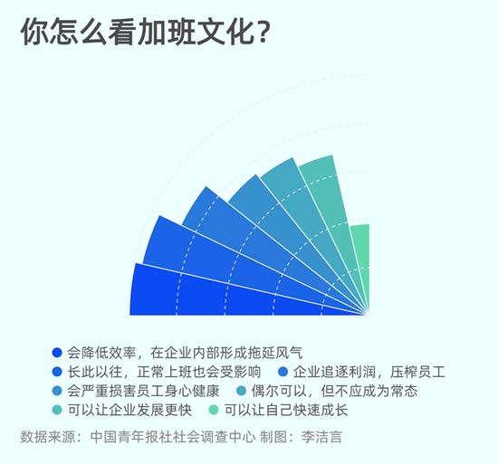 調(diào)查中,對于加班文化,49.8%受訪者認(rèn)為會降低效率,在企業(yè)內(nèi)部形成拖延風(fēng)氣,48.4%的受訪者感覺長此以往,正常上班也會受影響,43.4%的受訪者認(rèn)為這是企業(yè)追逐利潤、壓榨員工的結(jié)果。