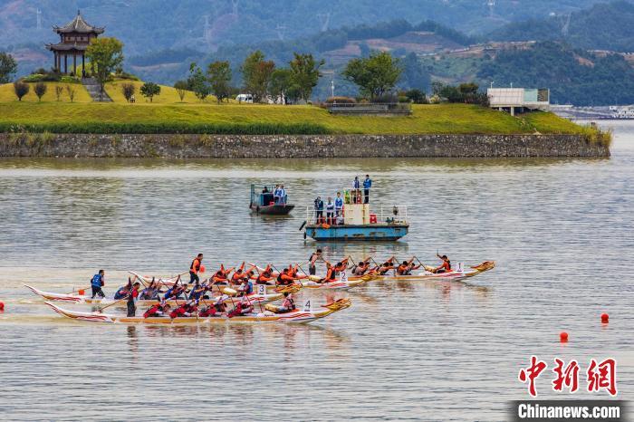 中新網(wǎng)湖北秭歸10月16日電 (李彩云 聶爽)2021中國龍舟爭霸賽10月15日至16日在湖北秭歸縣徐家沖港灣國家級龍舟訓練基地舉行,此次比賽也是符合奧運標準的競技龍舟亮相東京奧運會后首次參與的正式比賽。來自福建、浙江、湖南及香港等地的12支龍舟隊乘風逐浪,擊水奮楫。