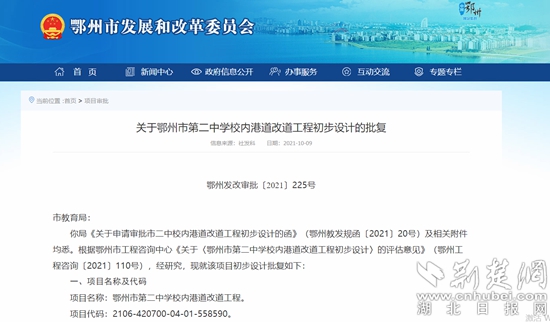荊楚網(wǎng)(湖北日報(bào)網(wǎng))訊(記者 阮瓊)日前,鄂州市發(fā)改委對鄂州市第二中學(xué)校內(nèi)港道改道工程初步設(shè)計(jì)進(jìn)行批復(fù)。該項(xiàng)目建設(shè)工期為6個(gè)月,概算投資1474.35萬元。