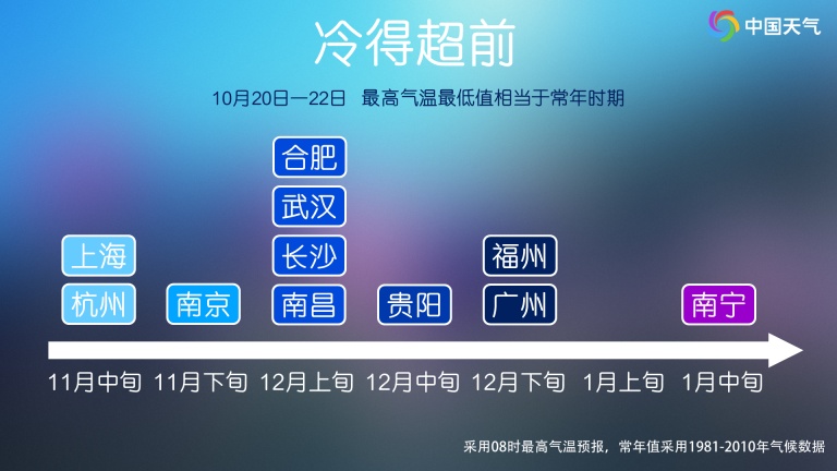 在冷空氣和持續(xù)陰雨的共同影響下,預(yù)計20日—21日,貴陽、武漢、南昌、福州、廣州等地從江南到華南,各大省會級城市的最高氣溫將紛紛創(chuàng)新低,其中福州和貴陽可能連續(xù)3天氣溫持續(xù)下滑,廣州也將提前感受到往年12月份才會出現(xiàn)的秋涼。