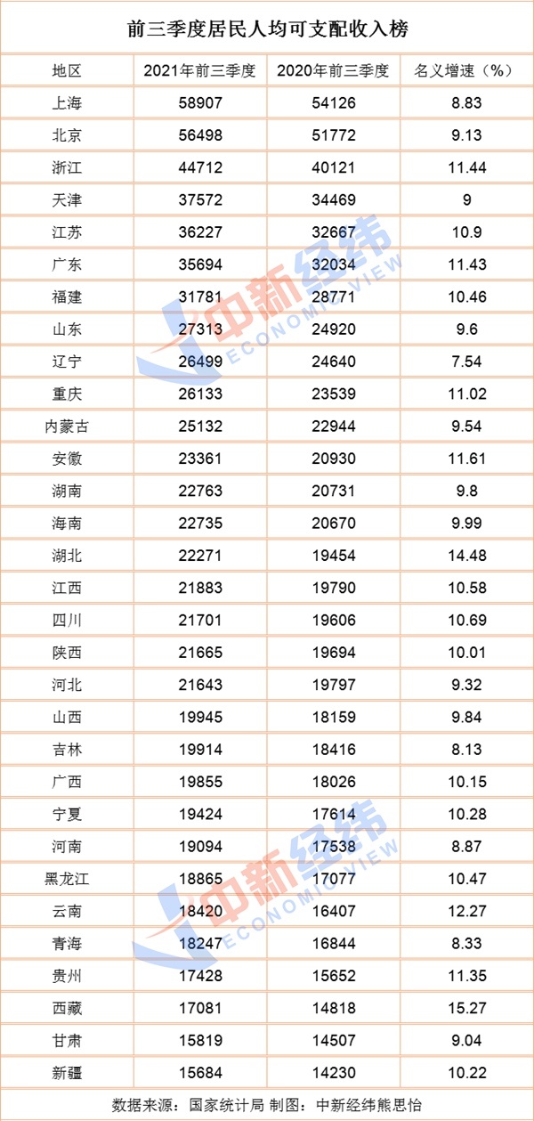 中新經(jīng)緯10月21日電 (熊思怡)20日晚間,國家統(tǒng)計局公布31省份前三季度居民人均可支配收入,上海、北京、浙江位居前三甲。