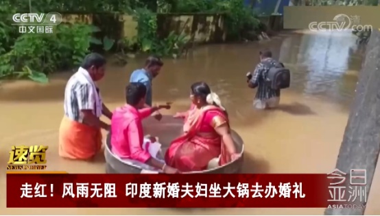 ·印度暴雨致多地洪災,一對新人坐大鍋去辦婚禮。