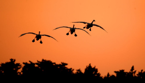 在山東省榮成市大天鵝國家級自然保護區(qū),大天鵝映著朝暉飛翔。
