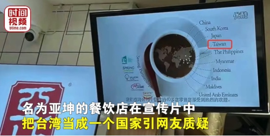 ·江蘇南京亞坤餐飲店宣傳片列出亞坤在海外分布的門店,竟將臺灣與中國韓國日本同列為國家,當?shù)厥斜O(jiān)局:已立案。