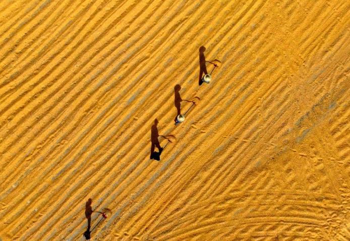 山東省臨沂市平邑縣農(nóng)民在晾曬收獲的玉米。