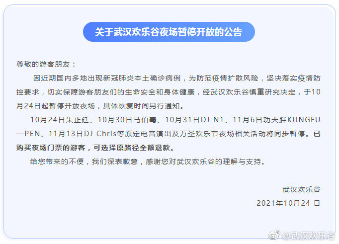 10月24日,@武漢歡樂谷 發(fā)布公告稱,因近期國內(nèi)多地出現(xiàn)新冠肺炎本土確診病例,為防范疫情擴(kuò)散風(fēng)險(xiǎn),經(jīng)武漢歡樂谷研究決定,于10月24日起暫停開放夜場(chǎng),具體恢復(fù)時(shí)間另行通知。10月24日朱正廷、10月30日馬伯騫、10月31日DJ N1、11月6日功夫胖KUNGFU—PEN、11月13日DJ Chris等原定電音演出及萬圣歡樂節(jié)夜場(chǎng)相關(guān)活動(dòng)將同步暫停。已購買夜場(chǎng)門票的游客,可選擇原路徑全額退款。