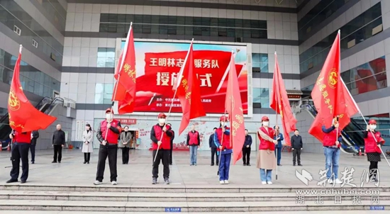 為了讓王明林志愿服務(wù)能“點燃一盞燈,照亮一大片”,活動現(xiàn)場,黃石市委宣傳部常務(wù)副部長王見祥、黃石港區(qū)委書記嚴(yán)榮勇、“黨史爺爺”“荊楚楷?!蓖趺髁值确謩e為10支“王明林志愿服務(wù)隊”代表授旗。