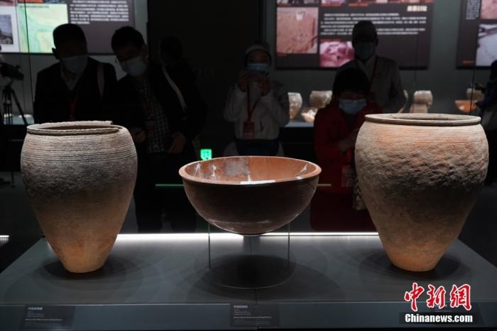10月17日,記者探訪位于三門峽市的廟底溝仰韶文化博物館。圖為展出的陶罐。 中新社記者 闞力 攝