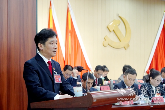 黃石港區(qū)委書(shū)記嚴(yán)榮勇作報(bào)告。記者 呂鑒蕾 攝