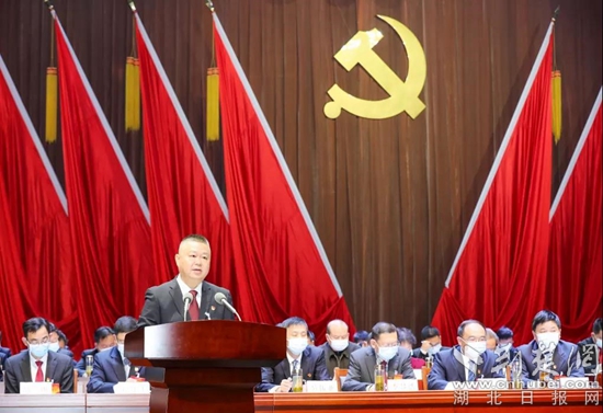 麻城市委書記汪國兵代表中共麻城市第八屆委員會作報告。 通訊員供圖