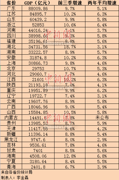 江蘇前三季度GDP同比增長10.2%,兩年平均增長6.3%,增速高于廣東的9.7%和5.1%。去年同期,江蘇GDP跟廣東的差距是4588.3億元,而現(xiàn)在只有3114.16億元,縮小了1400多億元。