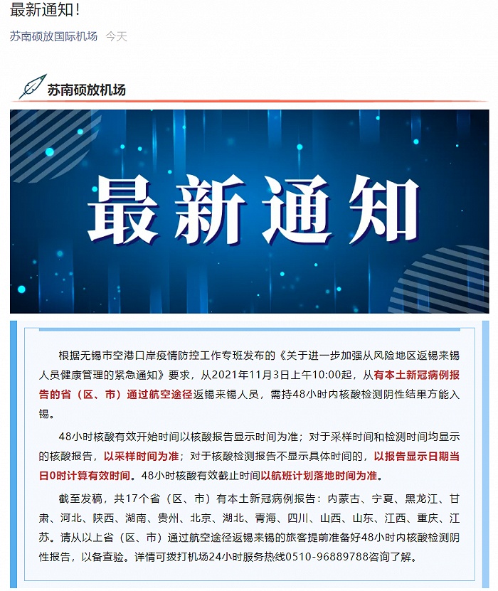 “蘇南碩放國際機(jī)場(chǎng)”微信公眾號(hào)11月3日消息,請(qǐng)從以下?。▍^(qū)、市)通過航空途徑返錫來錫的旅客提前準(zhǔn)備好48小時(shí)內(nèi)核酸檢測(cè)陰性報(bào)告,以備查驗(yàn)。具體包括:內(nèi)蒙古、寧夏、黑龍江、甘肅、河北、陜西、湖南、貴州、北京、湖北、青海、四川、山西、山東、江西、重慶、江蘇。