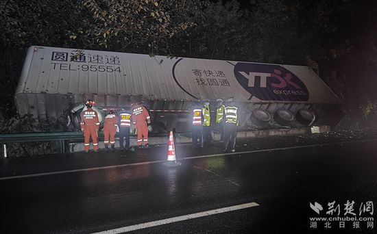 當(dāng)天凌晨3時(shí)53分,消防人員第一時(shí)間趕到現(xiàn)場(chǎng)經(jīng)偵查發(fā)現(xiàn):在高速路一處橋洞上方,一輛載貨2噸的圓通速遞箱式大貨車撞出護(hù)欄外,車廂半邊懸空兩頭側(cè)倒在山體上,恰巧車頭彎折懸空在一條三米多洞坑中,司機(jī)受傷被困在方向盤和座椅之間,疼痛難忍不停地喊疼。