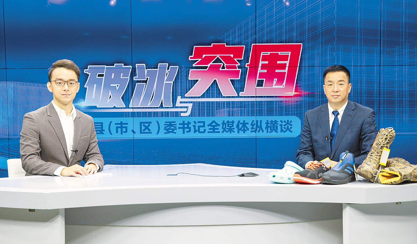 “這雙輕工業(yè)防護功能鞋,防砸、防滑、抗靜電,市售價達600元。”演播室內(nèi),談起陽新的各類鞋品,萬鼎如數(shù)家珍。