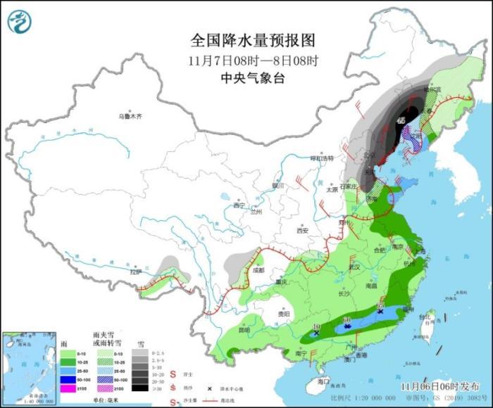 11月7日08時至8日08時,內(nèi)蒙古東南部、華北東部、東北地區(qū)中南部、黃淮東北部等地的部分地區(qū)有大到暴雪,其中,內(nèi)蒙古東南部、河北東北部、吉林西部、遼寧西部等地局地大暴雪或特大暴雪(30~45毫米)。東北地區(qū)東南部、遼寧東部、黃淮東部、江淮東部、江南東部和南部、華南北部等地的部分地區(qū)有中到大雨,其中,福建西南部、廣東北部等地局地暴雨(50~65毫米)。西北地區(qū)東部、內(nèi)蒙古中東部、華北中南部、東北地區(qū)中南部、黃淮、江淮、江漢、江南中東部、華南中東部等地的部分地區(qū)有4~6級風(fēng),陣風(fēng)7~8級(見圖5)。