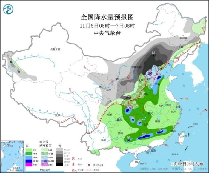 11月6日08時至7日08時,內(nèi)蒙古中部和東南部、山西大部、河北中北部、北京、天津、遼寧西部以及陜西北部和中南部山區(qū)、河南西部等地的部分地區(qū)有大到暴雪,其中,內(nèi)蒙古中部、河北西北部、山西東北部等地局地有大暴雪(20~28毫米)。華北南部、黃淮中西部、西南地區(qū)東部、江漢西部、江淮西部、江南西部和南部、華南北部等地的部分地區(qū)有中到大雨,其中,山東北部、重慶東部、福建西南部、廣東北部、廣西東北部等地局地暴雨(50~65毫米)。西北地區(qū)中東部、華北西部和北部、東北地區(qū)中南部、黃淮西部、江南東北部等地部的分地區(qū)有4~6級風(fēng),陣風(fēng)7~8級(見圖4)。
