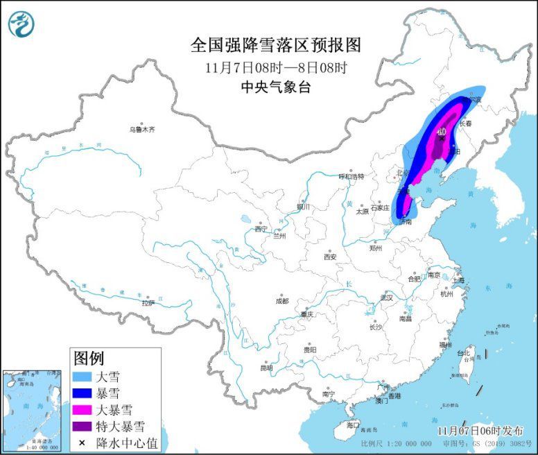 預(yù)計(jì)11月7日08時(shí)至8日08時(shí),內(nèi)蒙古東南部、河北東部、天津、山東西北部、遼寧中西部、吉林西部、黑龍江西南部等地的部分地區(qū)有大到暴雪,其中,河北東部、山東西北部、內(nèi)蒙古東南部、遼寧中西部、吉林西部等地局地有大暴雪或特大暴雪(20~40毫米)。上述部分地區(qū)新增積雪深度5~15厘米,局地可達(dá)20~40厘米以上(圖3)。為此,中央氣象臺(tái)11月7日06時(shí)繼續(xù)發(fā)布暴雪橙色預(yù)警。8日08時(shí)至10日08時(shí),強(qiáng)降雪區(qū)向東北方向移動(dòng),內(nèi)蒙古東南部、遼寧中北部、吉林西部、黑龍江中西部等地的部分地區(qū)有暴雪到大暴雪、局地特大暴雪。