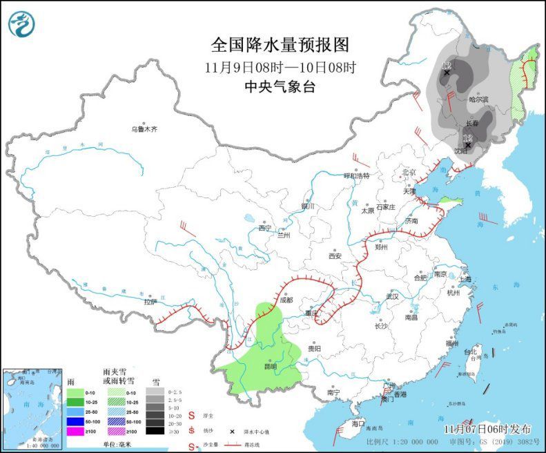 11月9日08時(shí)至10日08時(shí),內(nèi)蒙古東部、東北地區(qū)大部等地部分地區(qū)有小到中雪或雨夾雪,其中,黑龍江西南部、吉林中部、遼寧北部等地部分地區(qū)有大雪,局地暴雪(10~12毫米)。內(nèi)蒙古中部和東南部、吉林西部等地部分地區(qū)有4~6級(jí)風(fēng),陣風(fēng)7~8級(jí)(見圖6)。