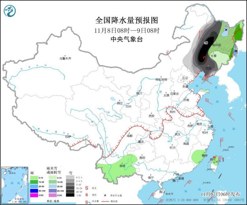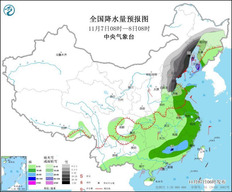 11月7日08時(shí)至8日08時(shí),內(nèi)蒙古東南部、河北東部、天津、山東西北部、遼寧中西部、吉林西部、黑龍江西南部等地的部分地區(qū)有大到暴雪,其中,河北東部、山東西北部、內(nèi)蒙古東南部、遼寧中西部、吉林西部等地局地有大暴雪或特大暴雪(20~40毫米)。黃淮東部、江淮東部、江南東部和南部、華南北部等地部分地區(qū)有中到大雨,局地有暴雨(50~60毫米)。遼寧北部、吉林西部、陜西北部、安徽大部、湖北中東部、湖南中部等地部分地區(qū)有5~7級(jí)風(fēng),陣風(fēng)8級(jí)(見圖4)。