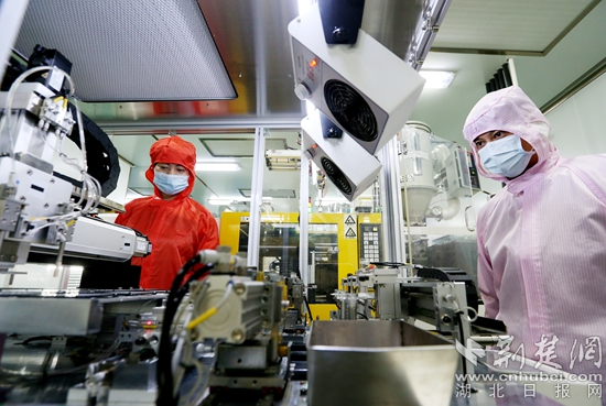 湖北云泰時代光學(xué)儀器有限公司(黃梅)員工在智能無塵凈化車間生產(chǎn)光學(xué)高清鏡頭。張鴻 攝