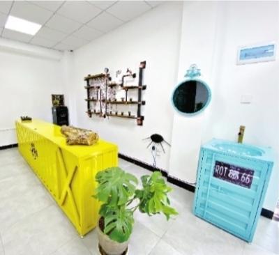 記者觀察到,健身區(qū)域的墻上,繪有停車警示線的標記、幽默的文創(chuàng)風(fēng)格標語、彩繪鐵皮汽油桶的桌椅;集裝箱式的彩色吧臺旁,墻面立柱被人工鑿出凹凸不平的效果,掛著復(fù)古的鐵藝壁燈;大屏幕前,一把由舊長椅手工打磨上漆改裝成的青金石藍靠椅特別醒目。