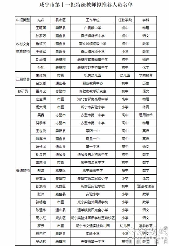 咸寧市第十一批特級(jí)教師擬推薦人員名單。來源:咸寧市教育局