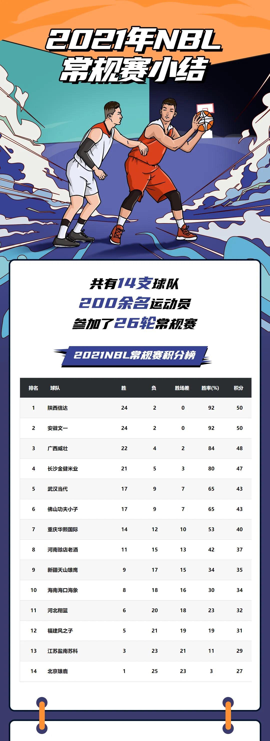 本賽季NBL常規(guī)賽于7月11日拉開帷幕,11月9日收官,最終陜西信達、安徽文一、廣西威壯和長沙金健米業(yè)四支勁旅分列常規(guī)賽前四。陜西信達和安徽文一戰(zhàn)績持平,同為24勝2負,彼此之間的交手也是1勝1負。但憑借著小分優(yōu)勢,陜西信達獲得常規(guī)賽冠軍,安徽文一屈居第二。廣西威壯則憑借著22勝4負位居第三。獲得第四名的長沙金健米業(yè)戰(zhàn)績?yōu)?1勝5負。