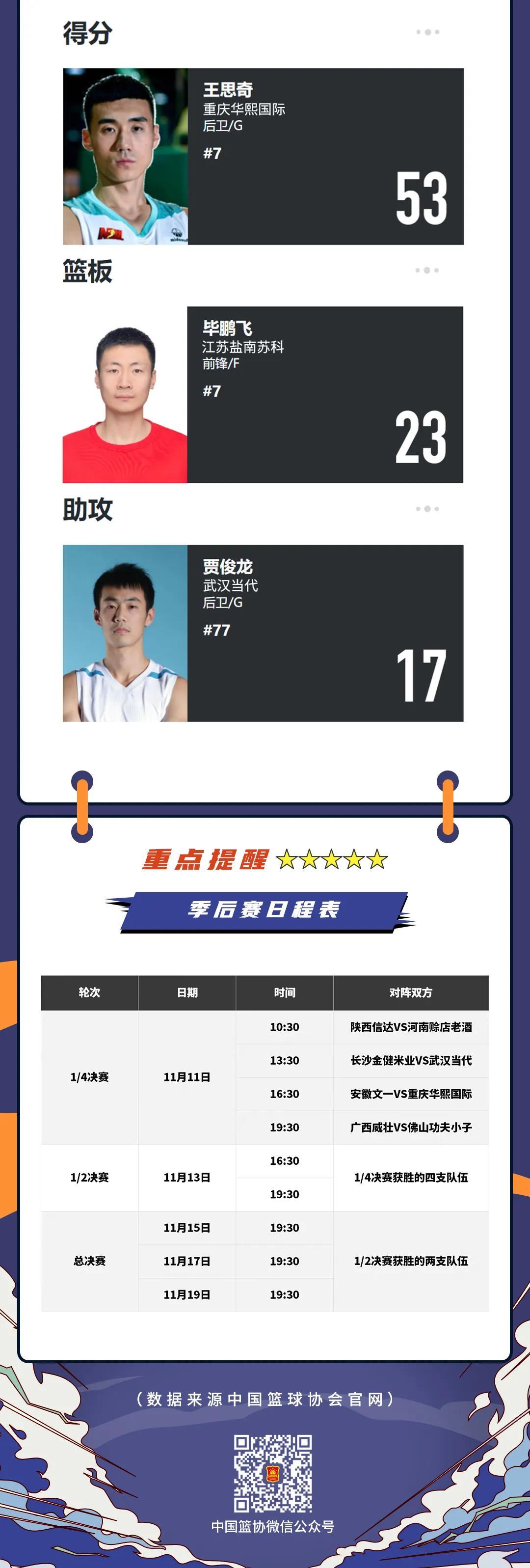 個人表現(xiàn)方面,場均得到27.6分的重慶華熙國際隊員王思奇榮膺聯(lián)賽得分王。11月7日,重慶華熙國際對陣江蘇蘇科雄獅,王思奇全場29投19中,砍下53分、11個籃板和6次助攻,這也是本賽季球員單場最高得分。