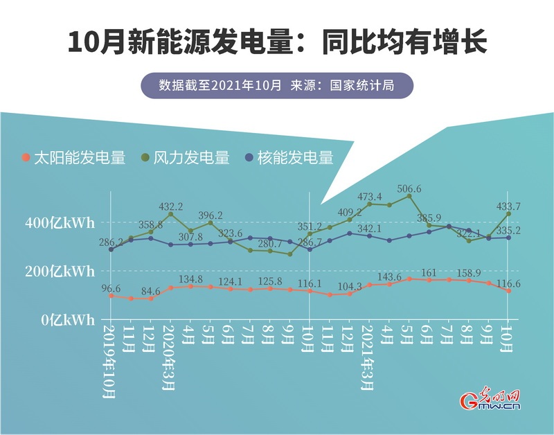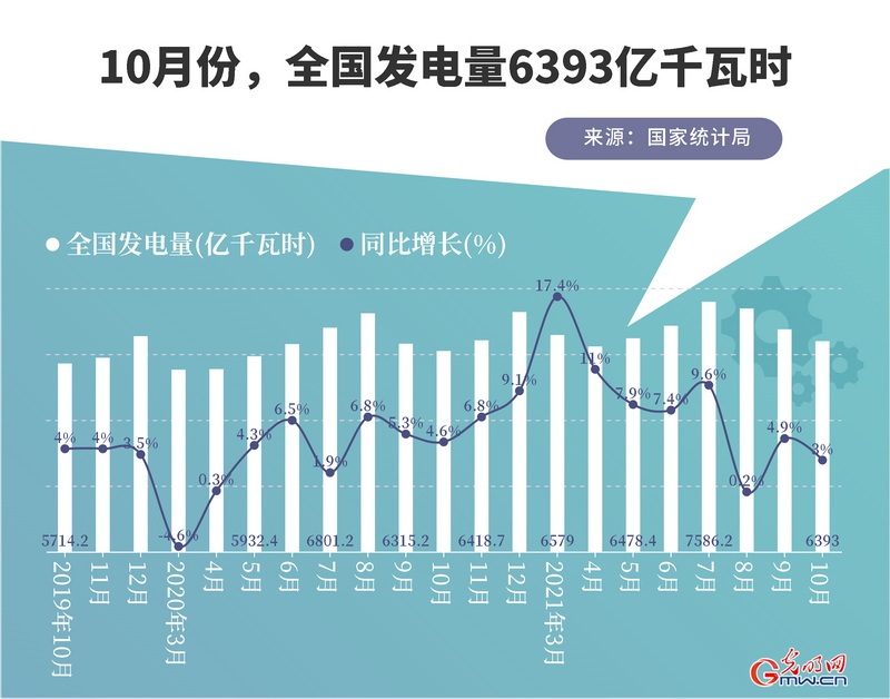 從發(fā)電看,1—10月,全國(guó)規(guī)模以上工業(yè)發(fā)電67176億千瓦時(shí),同比增長(zhǎng)10.0%,比2019年同期增長(zhǎng)11.5%,兩年平均增長(zhǎng)5.6%。10月份,全國(guó)發(fā)電量6393億千瓦時(shí),同比增長(zhǎng)3.0%。其中,火電、核電、風(fēng)電、太陽(yáng)能發(fā)電同比分別增長(zhǎng)5.2%、16.9%、23.5%、0.4%,水電同比下降11.9%。