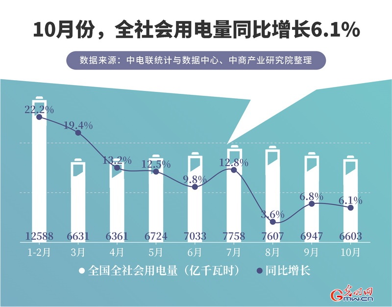 從用電看,1—10月,全國(guó)全社會(huì)用電量同比增長(zhǎng)12.2%。其中,一產(chǎn)、二產(chǎn)、三產(chǎn)和居民生活用電量分別增長(zhǎng)18.4%、11.3%、20%和7.4%。分地區(qū)看,全國(guó)22個(gè)省(區(qū)、市)用電增速超過10%,其中西藏、湖北、江西、青海、浙江、福建、四川、廣東、陜西9個(gè)?。▍^(qū))增速超過15%。10月份,全社會(huì)用電量同比增長(zhǎng)6.1%。